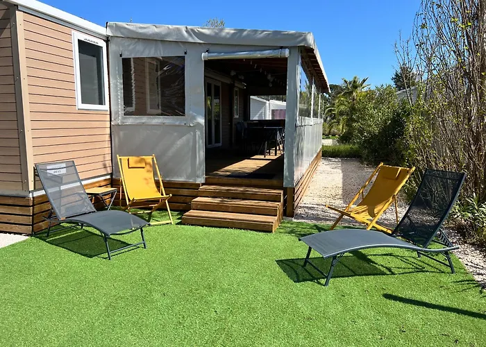 Mobil-home cosy 6 p climatisé à Hyères à 200 m de la mer dans camping 4 étoiles calme et familial